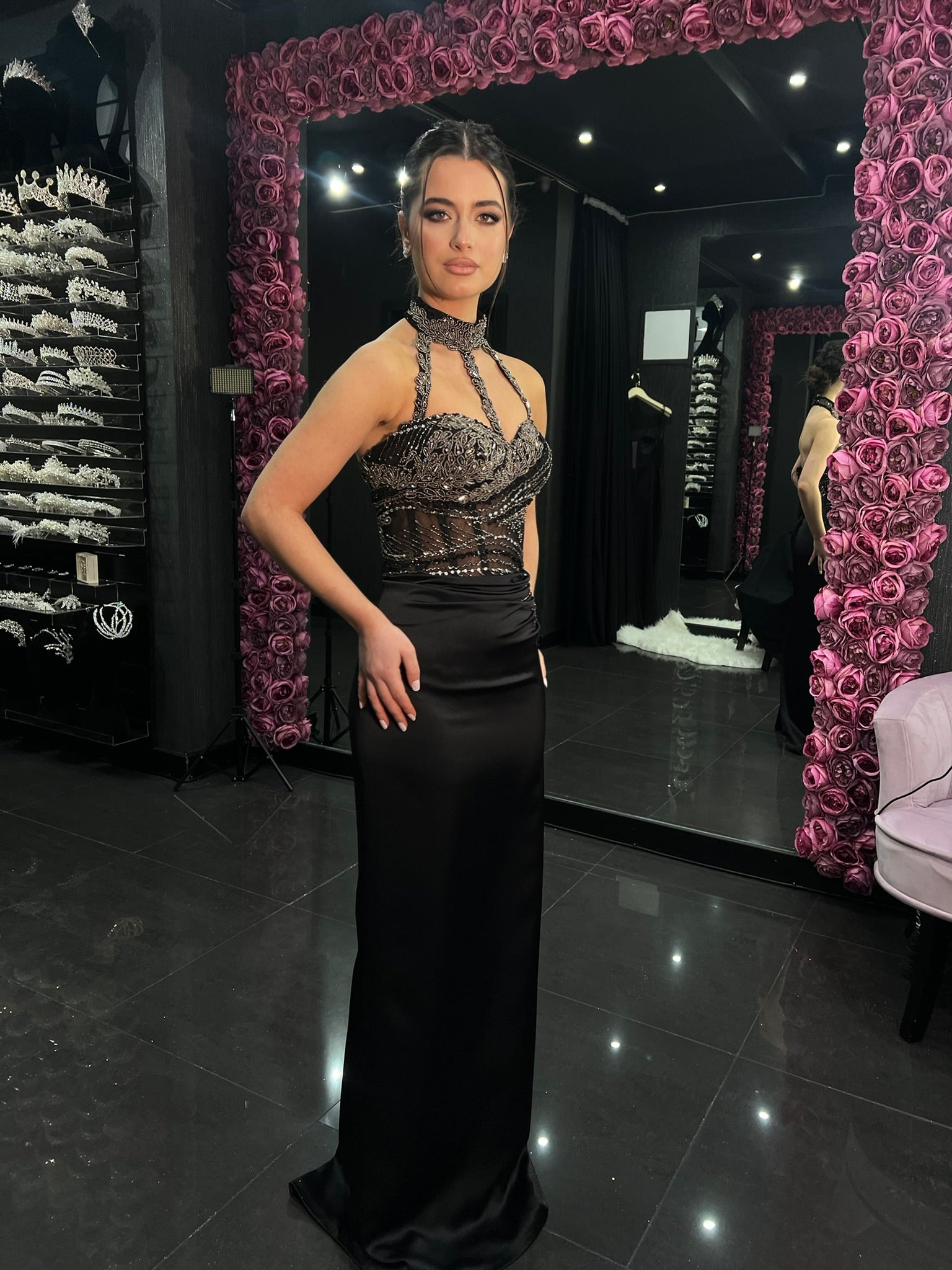 The AVEN dress features a refined sweetheart neckline paired with a delicate choker detail that enhances its elegant silhouette. Its structured corset design offers a flattering fit, while the subtle back split adds a hint of sophistication and ease of movement, making it perfect for formal occasions.