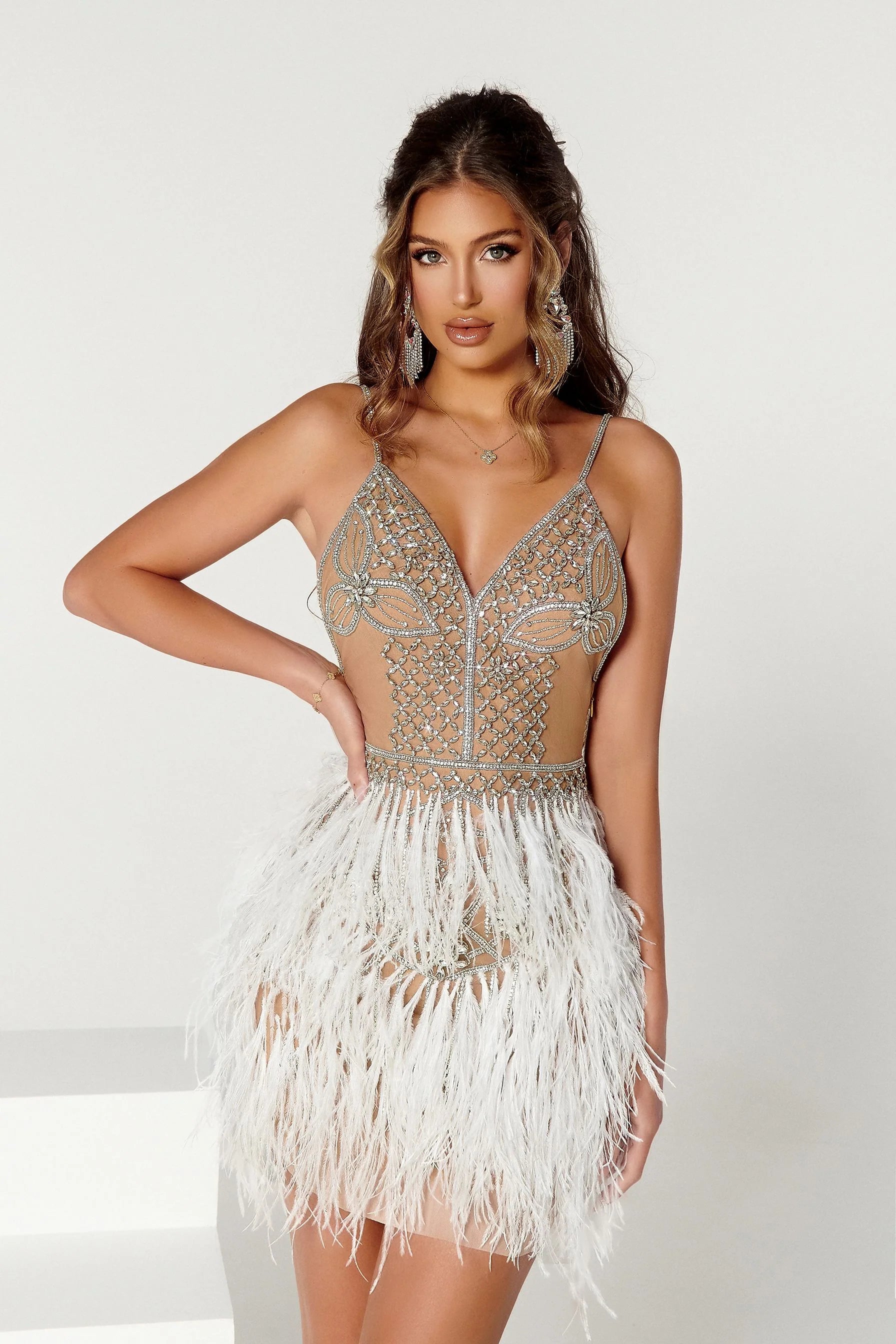 Elevate your evening look with the BEAU mini dress, featuring a delicate feather skirt that adds graceful movement. The sophisticated V-neckline and slender spaghetti straps frame the shoulders elegantly, while the backless design brings a daring yet refined allure. Perfect for special occasions, this dress blends bold style with timeless charm.