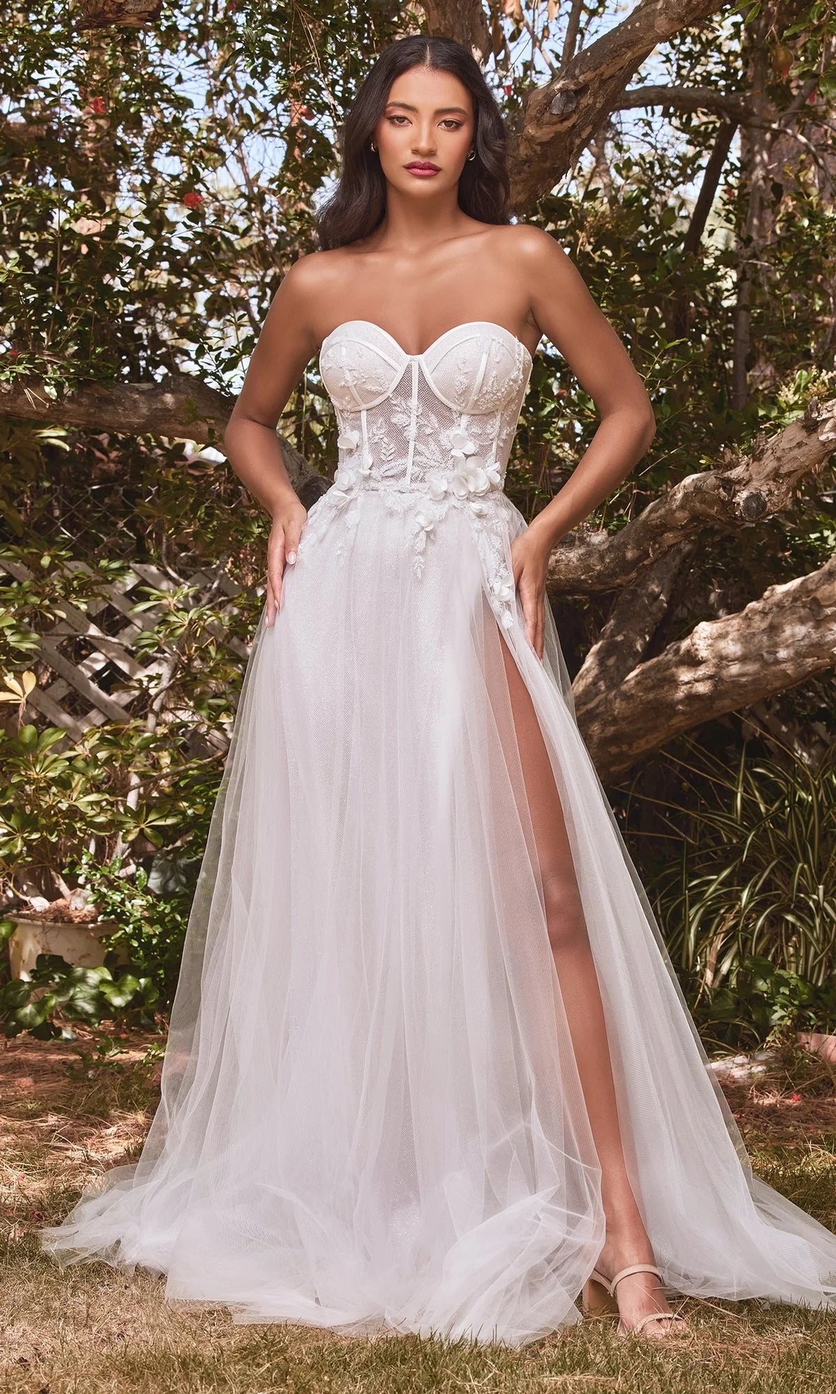 Embrace elegance in the DARINIA strapless ball gown, featuring delicate floral appliques that bloom across layers of shimmering tulle. The structured bodice, tailored to accentuate the waist, pairs effortlessly with optional off-the-shoulder puff sleeves embellished with intricate beading and floral details, creating a timeless silhouette perfect for grand occasions.