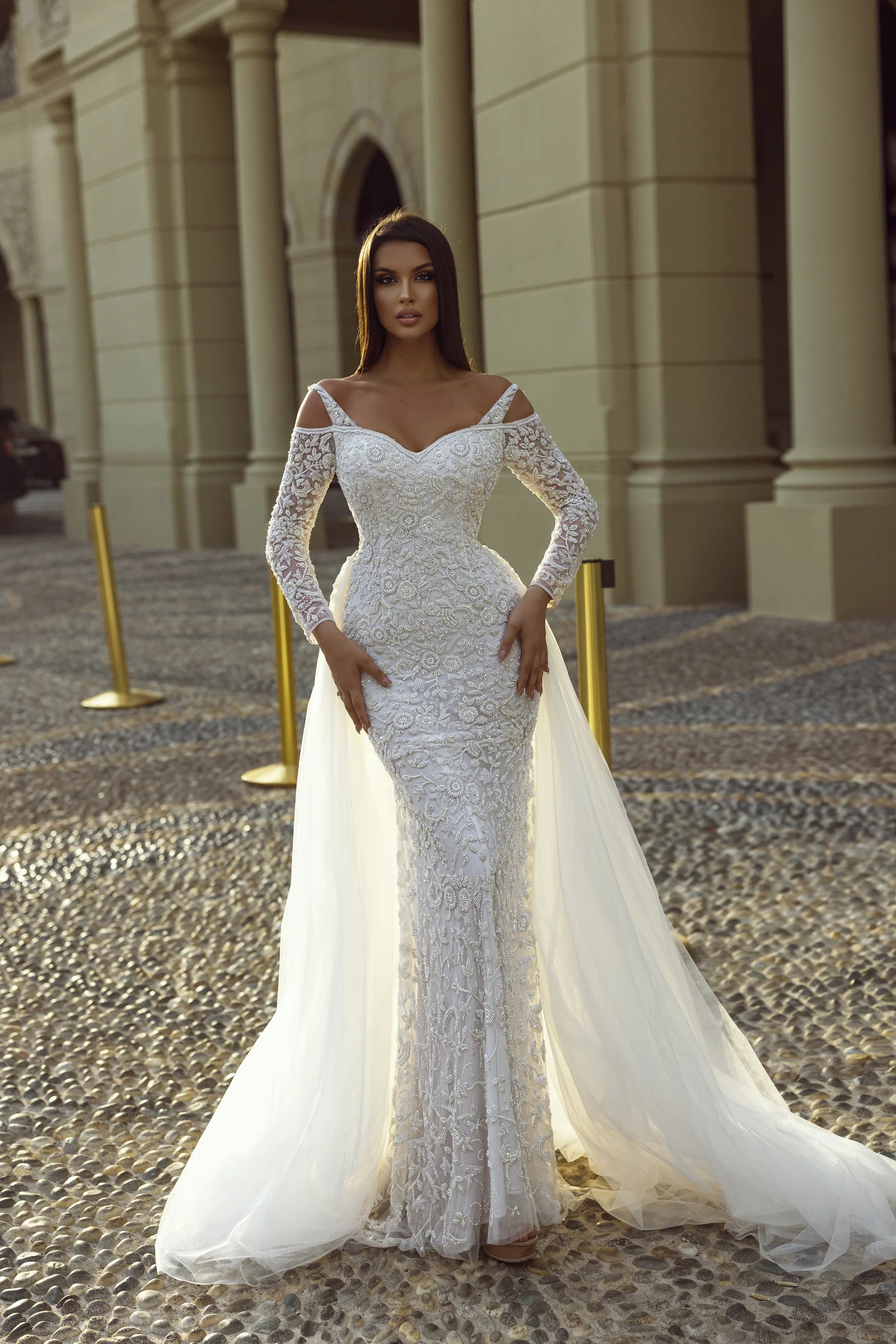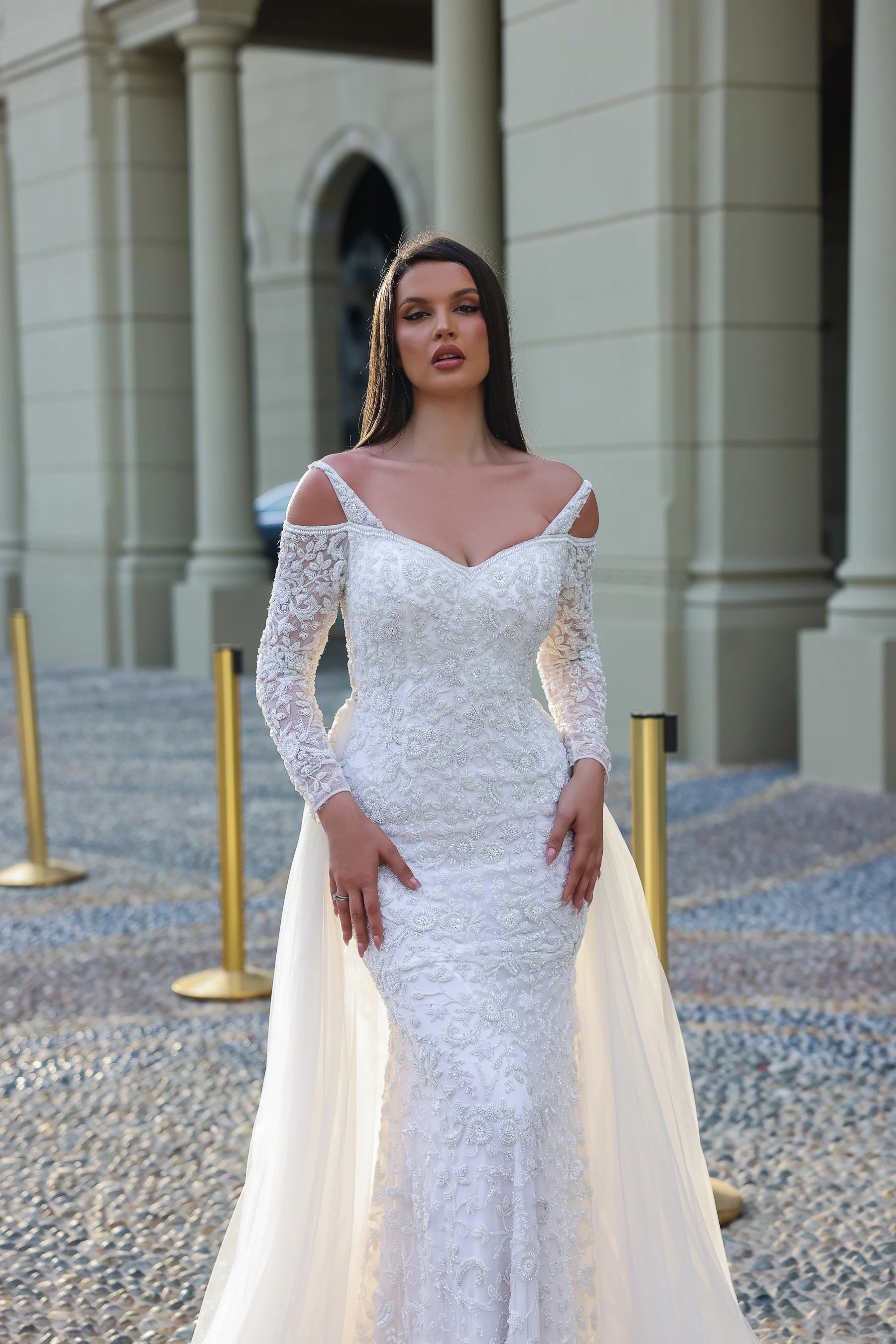 Elevate your bridal elegance with the MELANIE gown, a fitted masterpiece crafted from intricate lace and delicate beaded embroidery. Its long sleeves and crew neckline create a timeless silhouette, while the low back with zipper closure adds a subtle modern allure. Designed to highlight your figure with refined detail, this floor-length dress offers a perfect blend of classic sophistication and contemporary charm for your unforgettable wedding day.