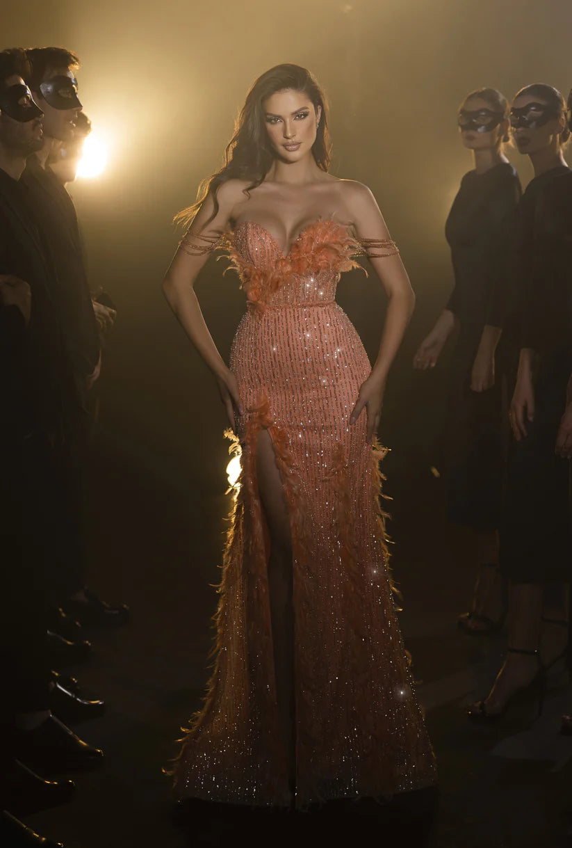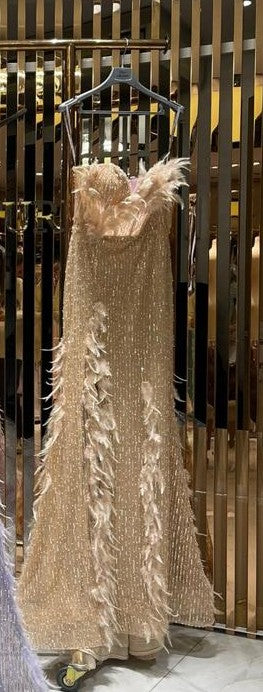 This exquisite strapless gown features delicate off-the-shoulder beaded detailing and shimmering sequins that catch the light beautifully. Accented with elegant feather trims and a tasteful front slit, it offers a graceful silhouette and subtle allure. The champagne hue enhances its refined charm, while the zip-back closure ensures a perfect fit for any formal occasion.