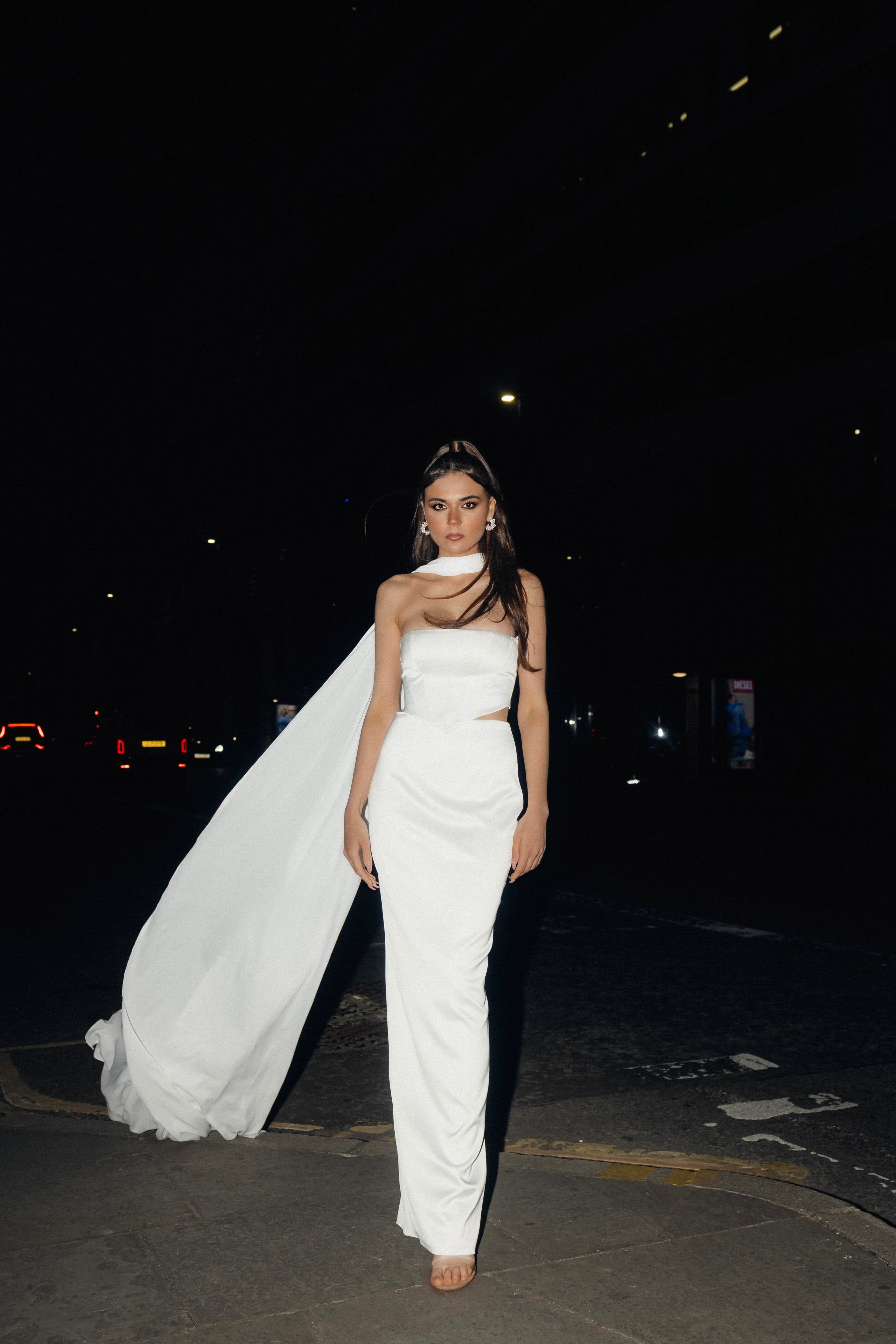 This elegant two-piece bridal set in ivory satin features a structured crop top with a corset bodice and a flattering tie-back closure, paired with a sleek pencil skirt that flows gracefully to the floor. A soft chiffon neck scarf adds an ethereal, sophisticated touch, creating a timeless look perfect for your wedding day or any formal occasion demanding refined style.